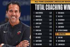 体育资讯4月3日讯 热火客场124-123力克凯尔特人,取得6连胜。 本场比赛过后,主教练斯波的生涯执教胜场数来到785场,超越吉恩-许(Gene Shue)升至历史第17位。...